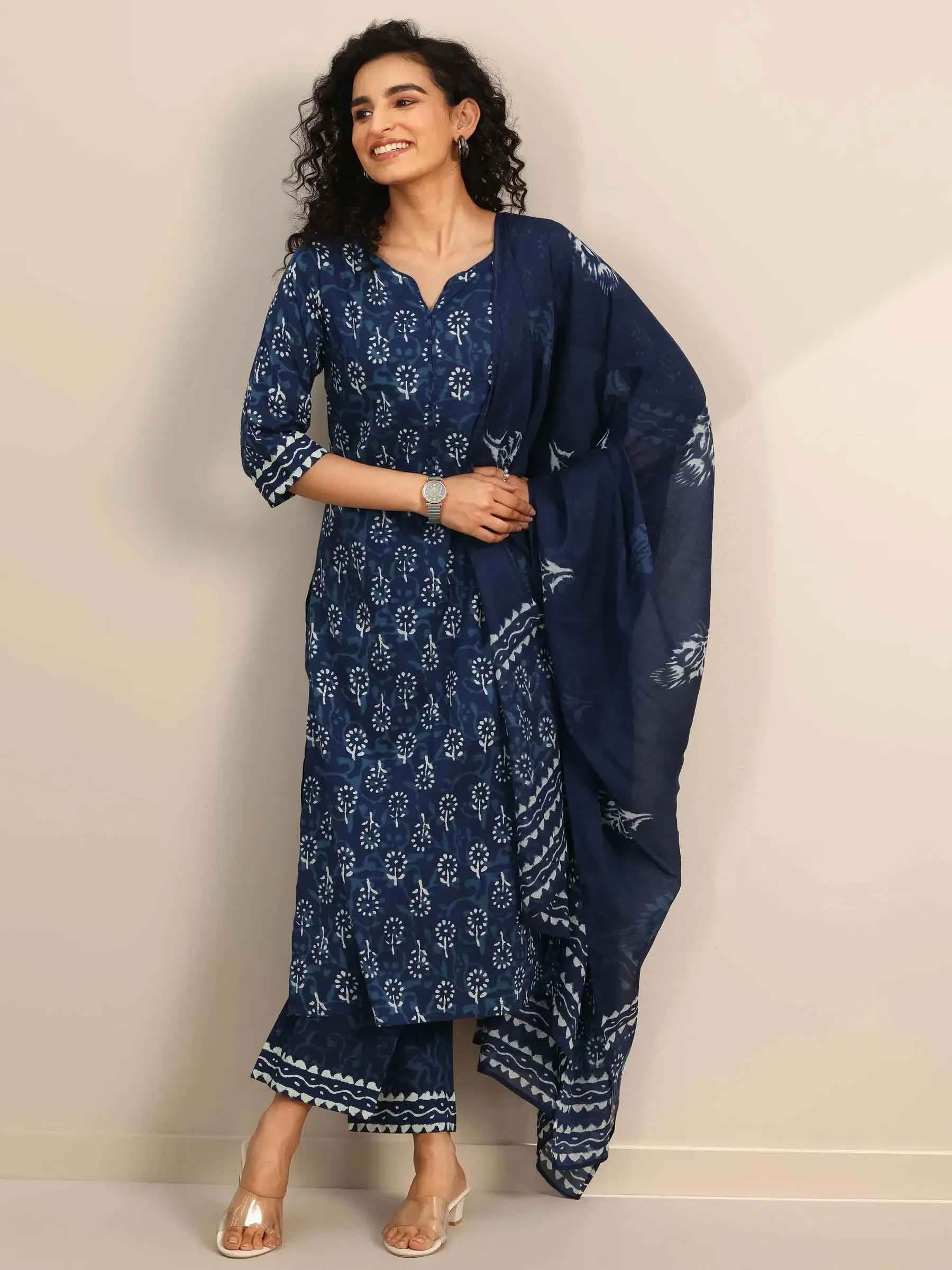 Our 3-piece Navy Blue Cotton suit set features a Straight-fit Kurta Set with a Notched Neckline, Regular Sleeves, and a statement yoke. Complemented with Straight Pants with an Elasticated waistband and a Printed dupatta. Adorned with Printed embellishments, this style is perfect for Casual occasions.